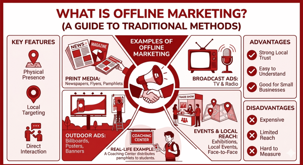 Offline marketing is the traditional way of promoting products. Even though digital marketing is growing, offline marketing still works effectively in many situations, especially for local businesses and direct communication.
